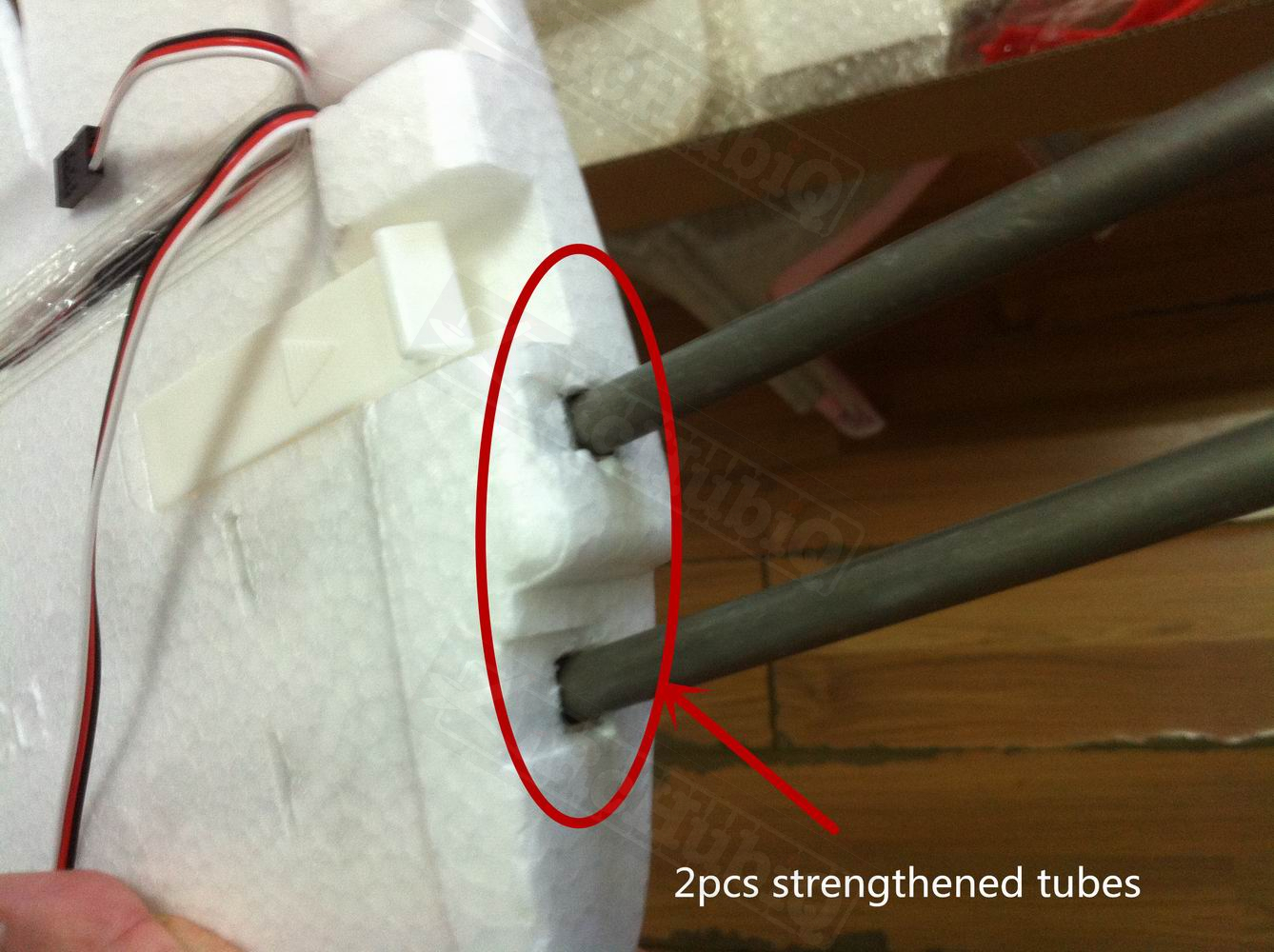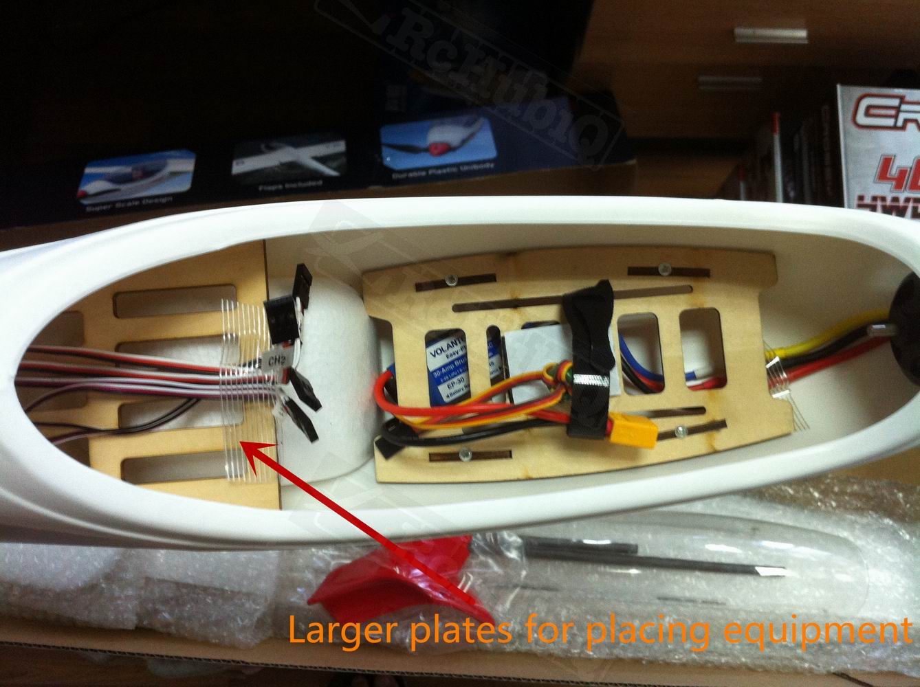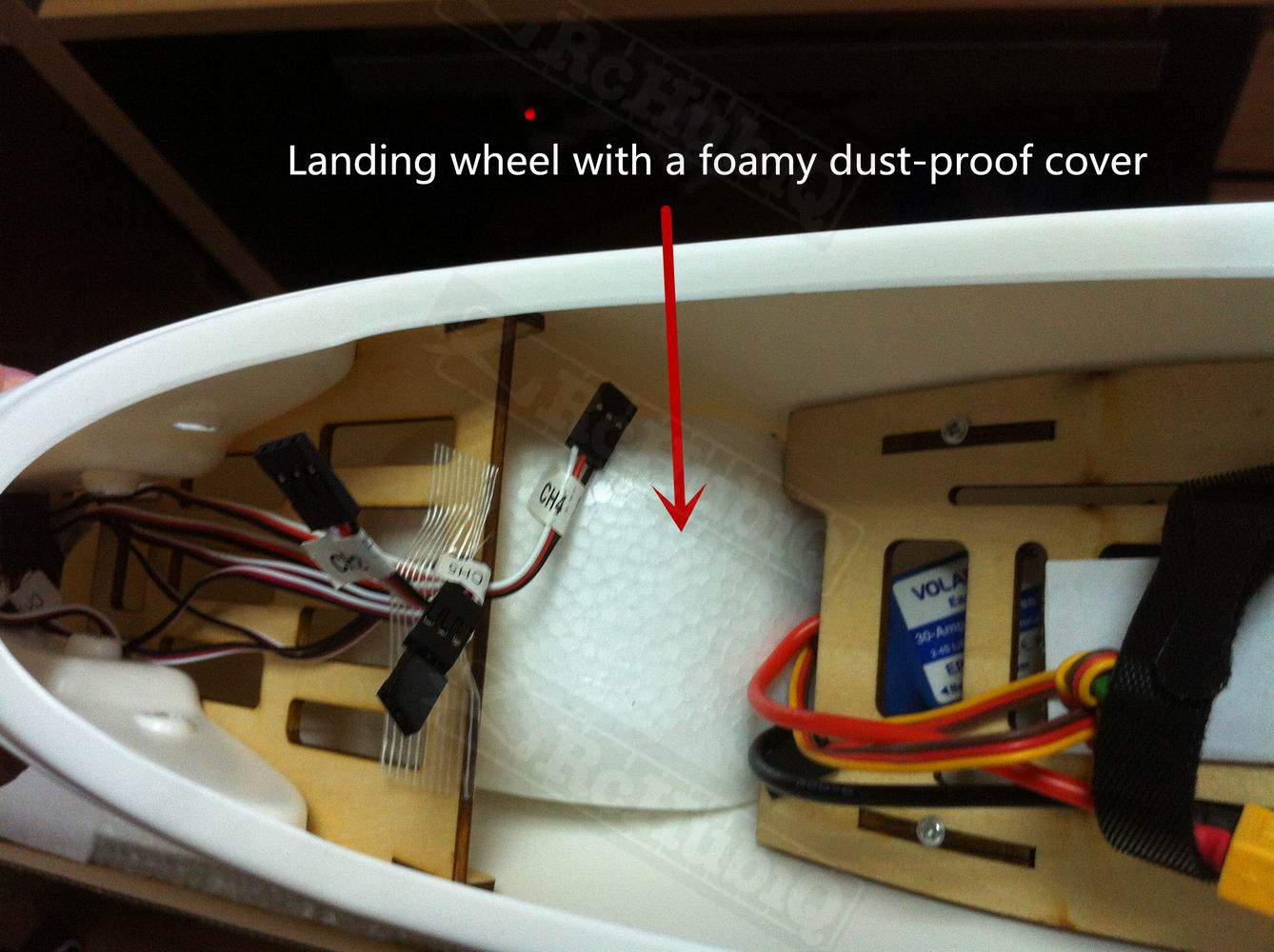 The battery can be accessed after removing the canopy that is secured with snap locks. The wings now have two spars to provide extra rigidity during loops and high bank turns. The wings are easier to install as well with a plastic latch to secure them in place. The room inside the fuse has been increased over the V1 so you can add FPV gear if that's your thing. They also added a wheel under the fuse for rolling landings.